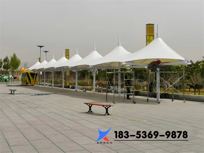 2、张拉式膜结构:由膜材料,钢缆和支柱组成,通过使用电缆和支柱将张力引入膜材料中以实现稳定性。除了创新,创新和美丽的形状,它也是展示膜结构精神的有能力的形式。近年来,大跨度空间主要由钢索和压缩材料组成,以支撑上部膜。由于施工精度高,结构性能强,表现力强,施工成本略高于骨架膜结构;
