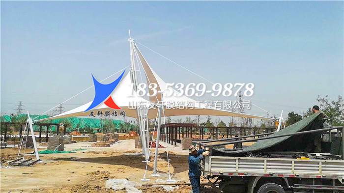 2、张拉式膜结构:由膜材料,钢缆和支柱组成,通过使用电缆和支柱将张力引入膜材料中以实现稳定性。除了创新,创新和美丽的形状,它也是展示膜结构精神的有能力的形式。近年来,大跨度空间主要由钢索和压缩材料组成,以支撑上部膜。由于施工精度高,结构性能强,表现力强,施工成本略高于骨架膜结构;