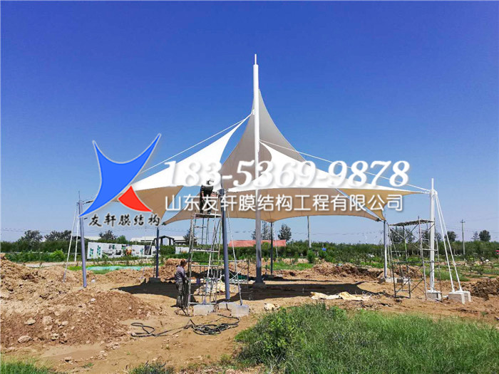 2、张拉式膜结构:由膜材料,钢缆和支柱组成,通过使用电缆和支柱将张力引入膜材料中以实现稳定性。除了创新,创新和美丽的形状,它也是展示膜结构精神的有能力的形式。近年来,大跨度空间主要由钢索和压缩材料组成,以支撑上部膜。由于施工精度高,结构性能强,表现力强,施工成本略高于骨架膜结构;